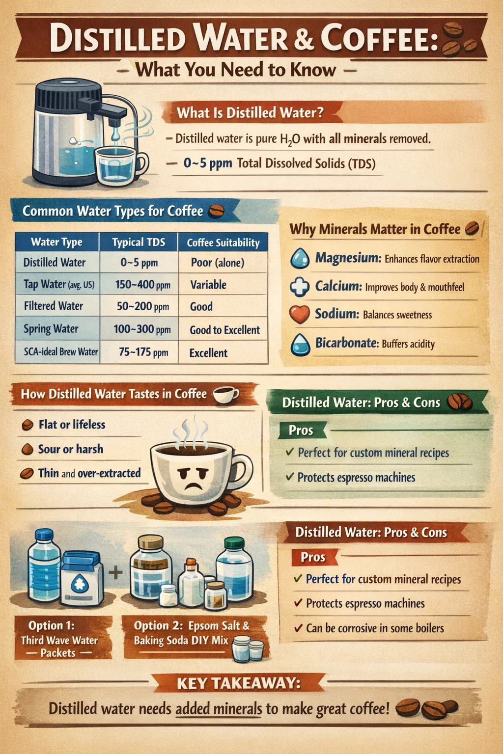 اگر یک دستگاه تقطیر آب در خانه دارید و میخواهید از آن برای قهوه استفاده کنید بدون اینکه عطر و طعم خود را از دست بدهید، راه حل ساده است: مواد معدنی را به مقدار کنترل شده اضافه کنید. در اینجا سه رویکرد عملی وجود دارد که از ساده ترین تا دقیق ترین آنها را شامل می شود.