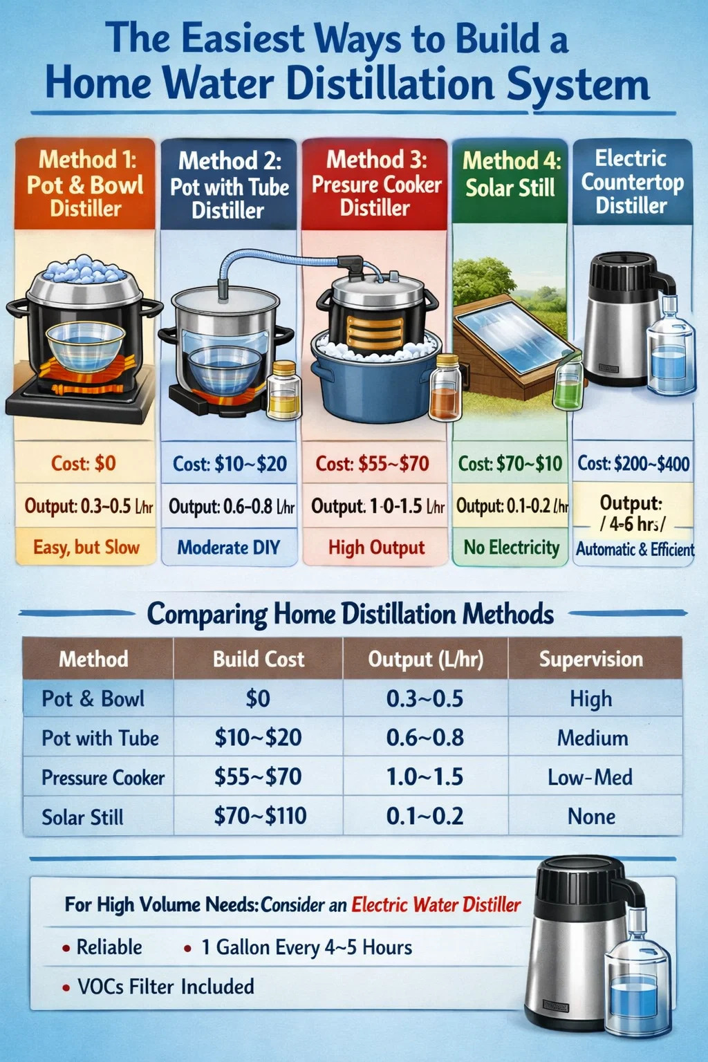 A pressure cooker-style DIY rig running for four hours per day can produce 4–6 liters, which is sufficient for cooking and drinking for one to two people. For a family of four relying on distilled water as a primary drinking source, a countertop electric water distiller producing one gallon per four-hour cycle — and capable of running multiple cycles per day — is a more practical solution than manual stovetop methods.