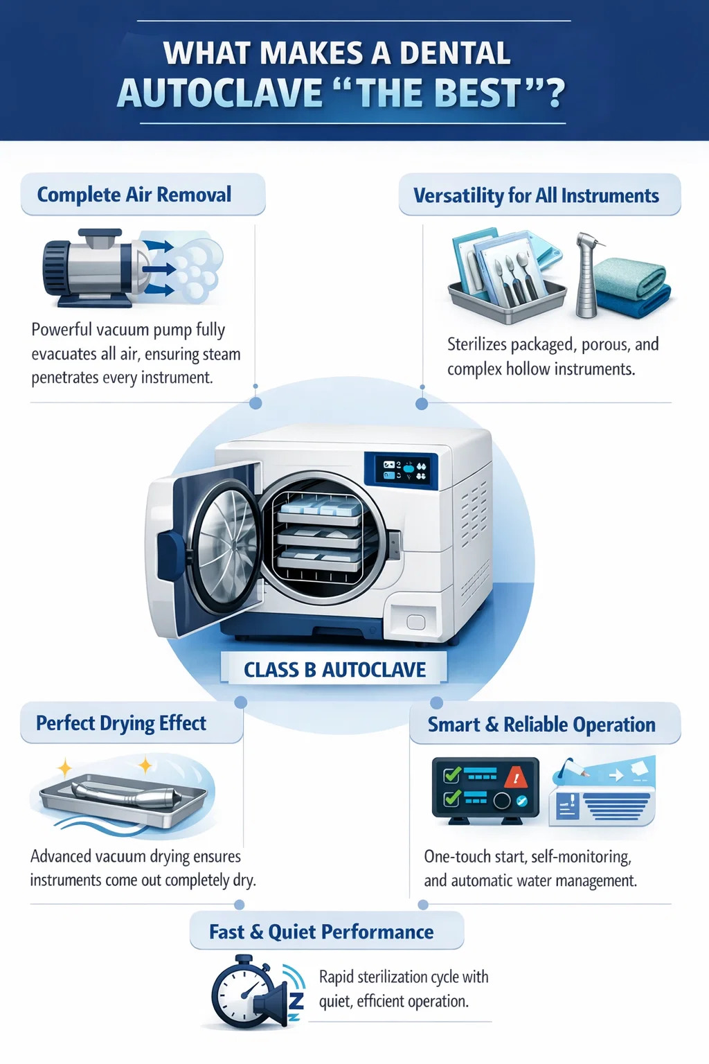 برای کلینیک های دندانپزشکی، یک مدل "بهترین های جهان" وجود ندارد، اما بهترین انتخاب پذیرفته شده عموماً به اتوکلاوهای دندانی کلاس B که می تواند موقعیت های مختلف پیچیده را مدیریت کند و پایدارترین عملکرد را ارائه دهد.