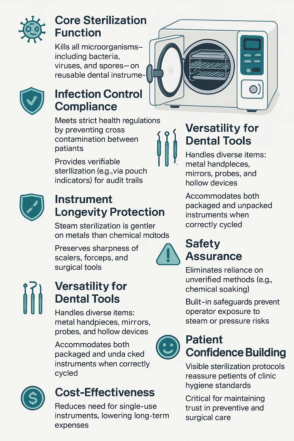 | ابزارها را استریل می کند | تمام باکتری ها، ویروس ها و هاگ ها را از بین می برد | اطمینان حاصل می کند که ابزارها از نظر بیولوژیکی برای استفاده مجدد ایمن هستند |